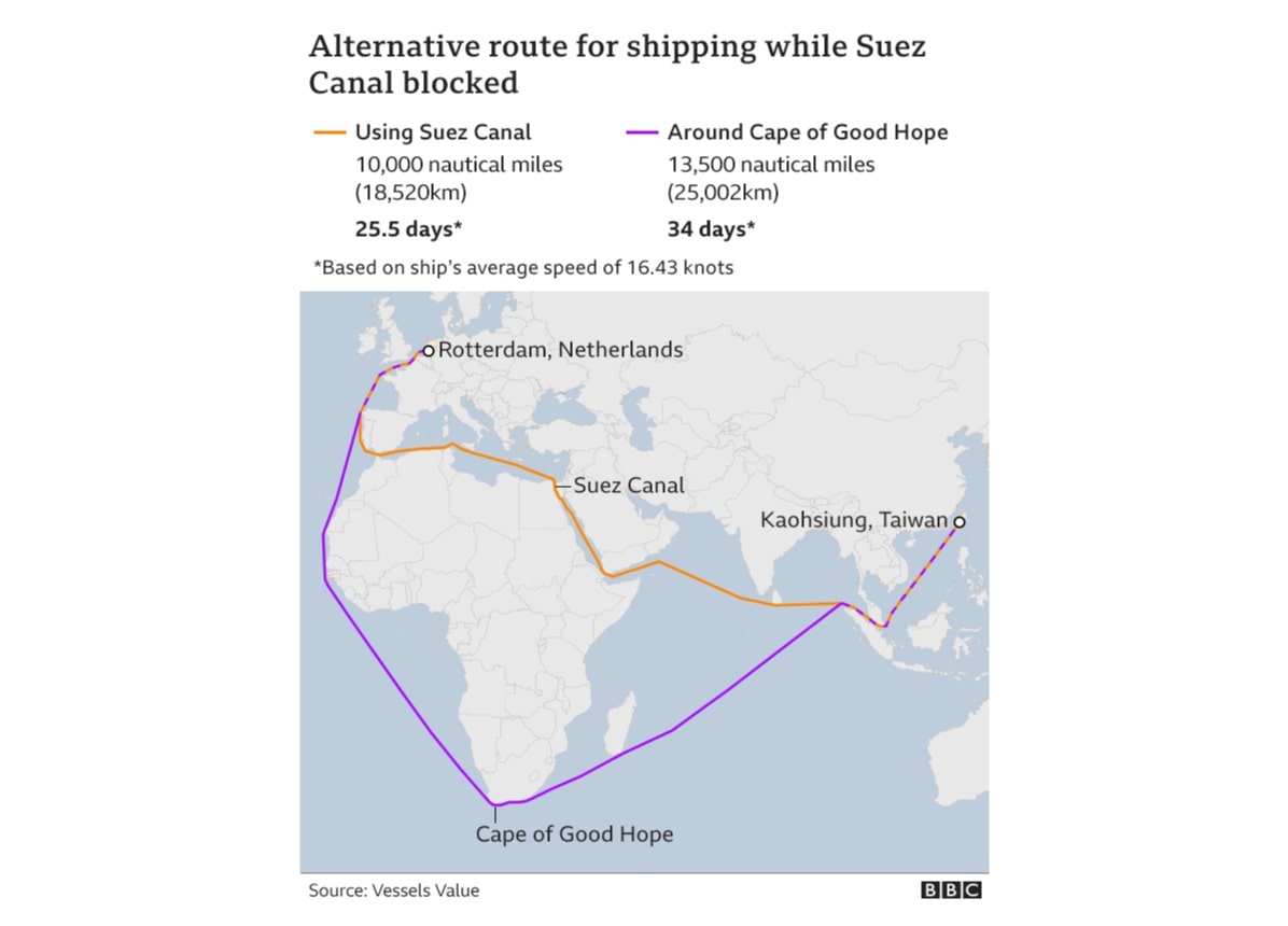 Some ships went around the whole of Africa to get to Asia. In addition to the lost time, they all spent an extra $400,000 on fuel to come all that way. Here's what that route looked like: