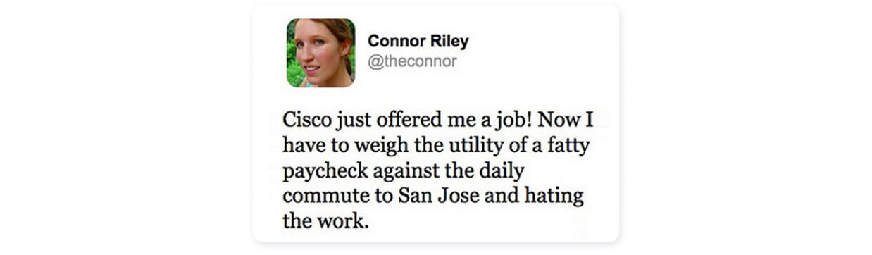 - American woman Connor Riley received an offer from Cisco and immediately shared the news with her Twitter followers on the joys. Riley's mistake was that the text was too ironic and even offensive to the company: