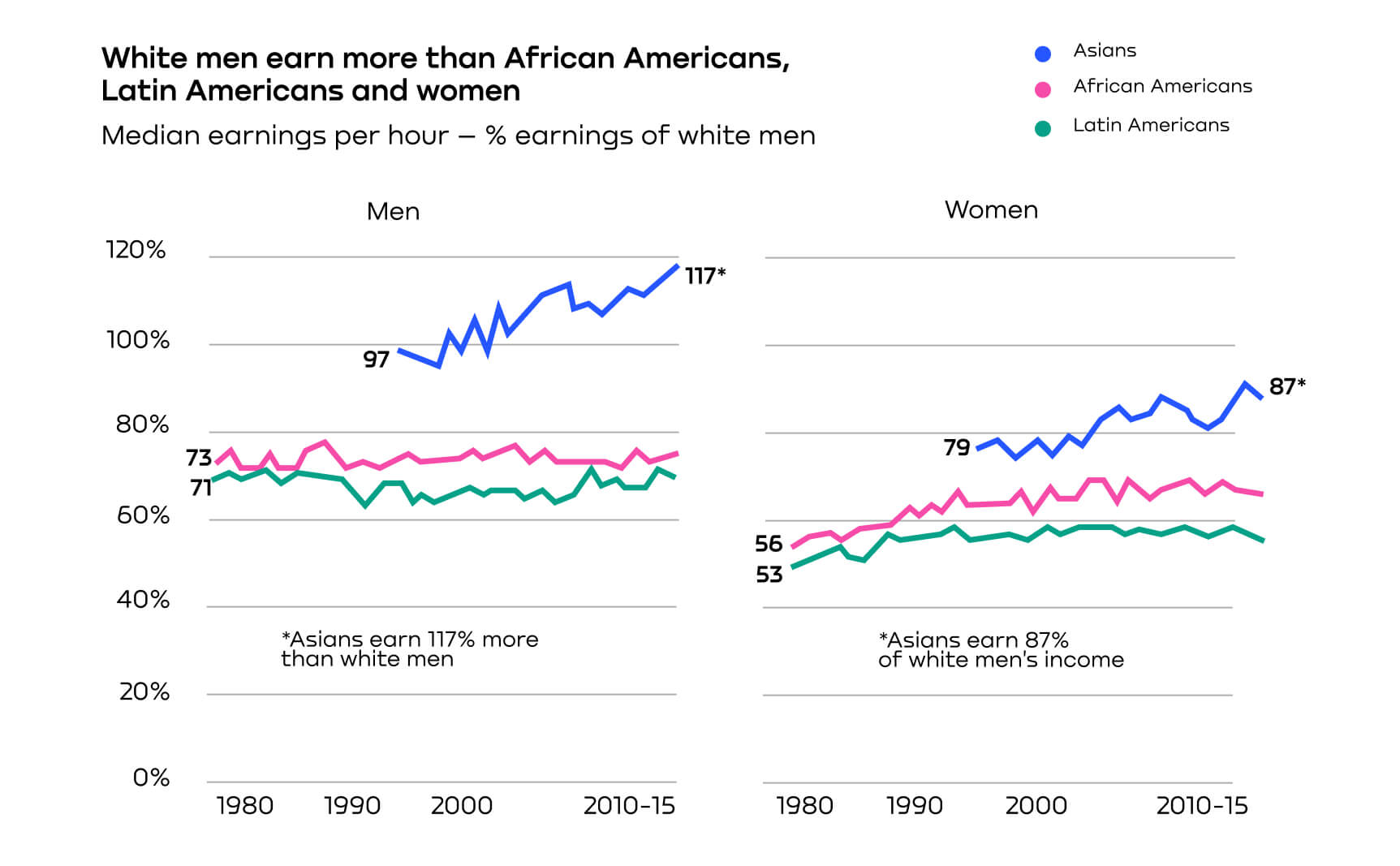 According to Pew Research Center's U.S. salary survey, African Americans and Latin Americans earn less than whites on average. Only the Asians managed to overtake the latter. Interestingly, women's salaries are lower than those of men of their race. However, at the same time, white and Asian women earn more than black and Hispanic men.