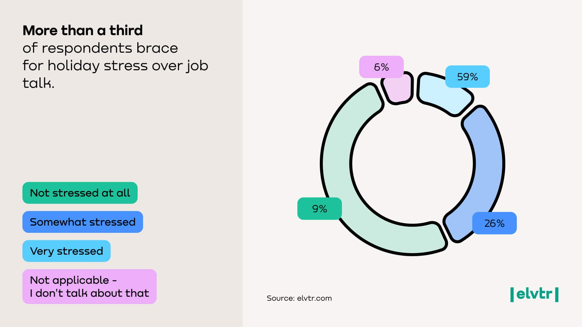 Younger respondents in their 20s are significantly more likely to feel stress about upcoming holiday gatherings due to job talk (42% feel at least somewhat stressed) than those in their 30s (29%). Overall, 35% of respondents report feeling “very” or “somewhat” stressed anticipating family comments about their career. This highlights a generational confidence gap, as older millennials appear more desensitized to family scrutiny than Gen Z adults.