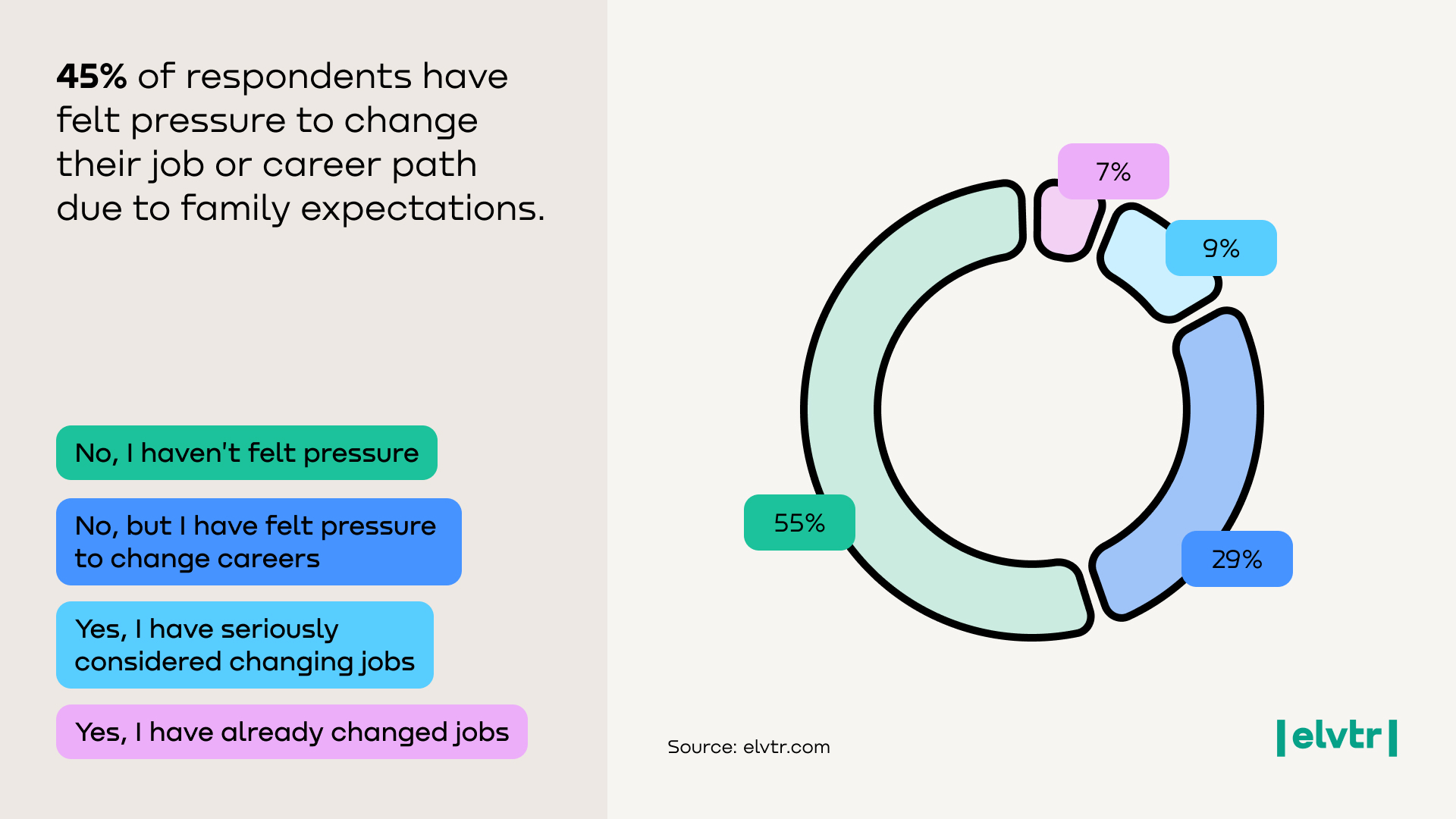 Family influence runs deep – 45% of respondents have felt pressured to change their job or career path due to family expectations. This figure includes 16% who went so far as to change jobs (7%) or seriously consider changing (9%) because of family opinions. The remaining 29% felt familial pressure to switch careers (although they ultimately did not), while 55% insist they’ve “never felt pressure” to change paths. Directional note: Respondents with at least one immigrant parent seem even more susceptible, with about 51% of second-generation Americans feeling pressure to alter their career vs. ~33% of those from non-immigrant families.