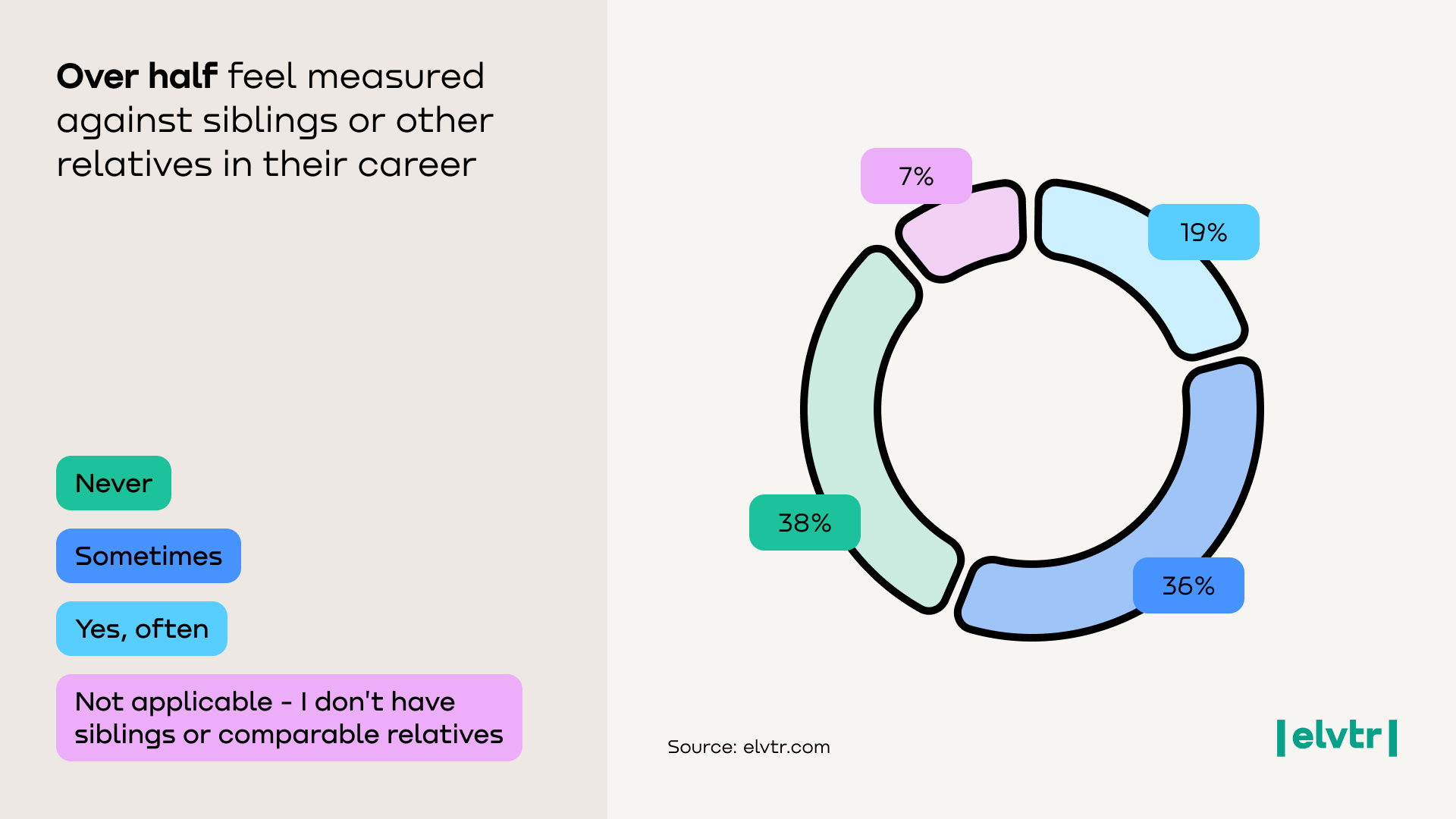 Feeling compared to siblings or cousins is a common experience: 55% report that their family at least “sometimes” compares relatives’ career success, including 19% who say it happens frequently. Only 38% never feel compared, while 7% are only children or have no comparable relatives. The tendency to compare achievements is amplified in bigger family gatherings – those with large extended-family holiday parties (9+ people) were considerably more likely to feel frequent career comparisons than those with only immediate family present (directionally, ~70% vs ~45% feeling at least occasional comparisons). With more relatives in the room (siblings, cousins, etc.), the “Who’s doing better?” dynamic intensifies.