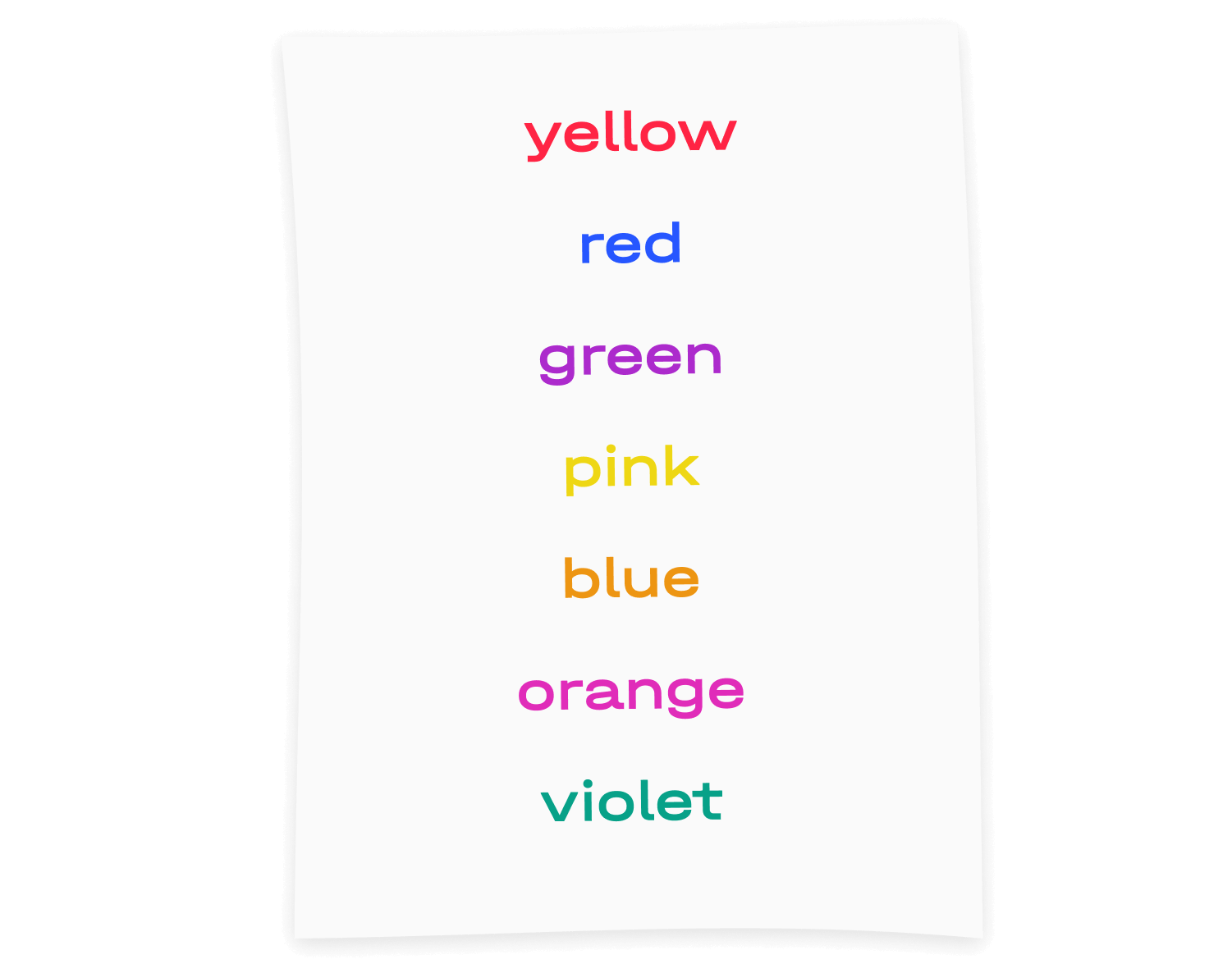 Reading fast requires a high concentration of attention. There are several exercises to develop it and avoid reading texts superficially. For example, you can use a sheet with the names of the colours printed in a coloured font but in a confusing way. The word “yellow” will be written in red letters, and the word “red” will be written in blue letters... For training, you need to name the colour, not the word on the sheet; at first, it is pretty tricky to do it.