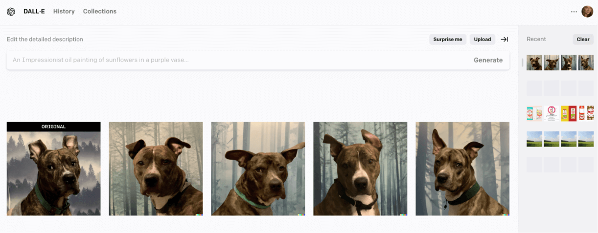 However, the author of this text did not give up and sent DALL-E a photo of her dog, as the dog cannot cite copyright infringement (although he should, looking at the result). Here are four variations that were generated:
