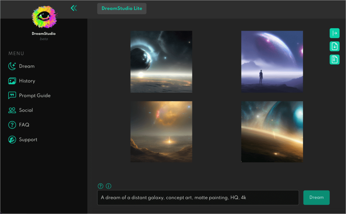 The ability to convert a user-drawn basic sketch into a quality image or create a picture from an uploaded image is the key feature of Dreamstudio. It is possible to adjust some parameters such as width and height during the operation.