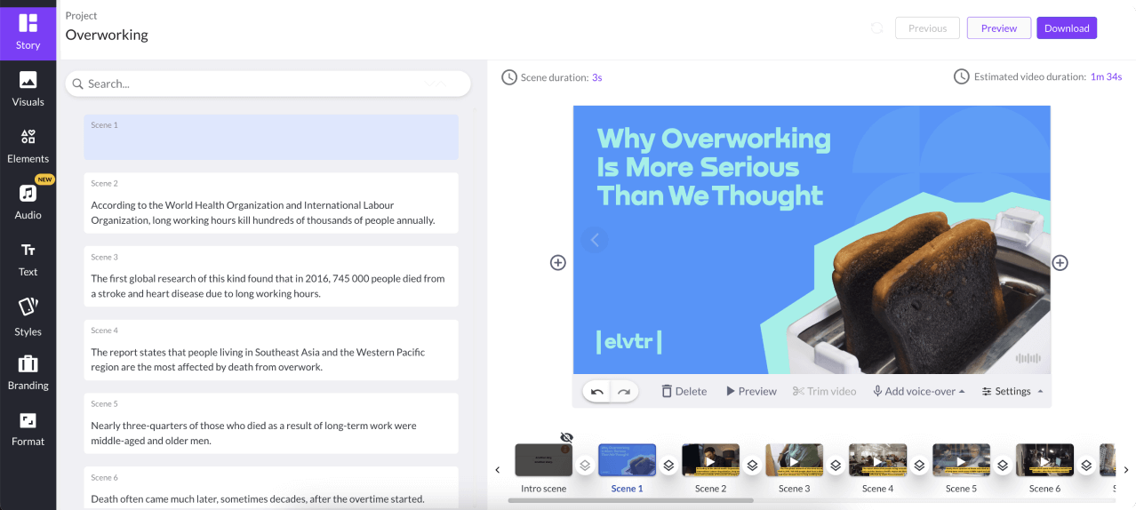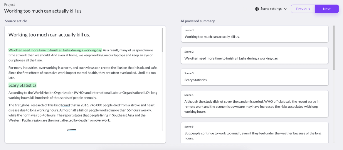 First, the AI analyses the text and searches for keywords. Then it splits the material into scenes for a future video. You can edit the scenes offered by the service: