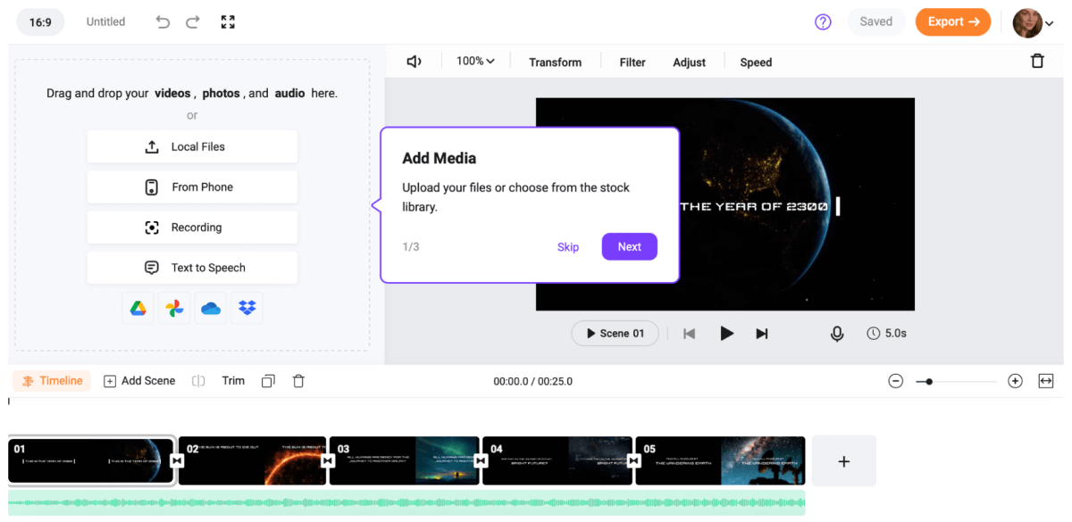 Next, the customisation of the video begins: you can rearrange the frames, upload your own clips, change the text, frame length, total time of the video, etc.