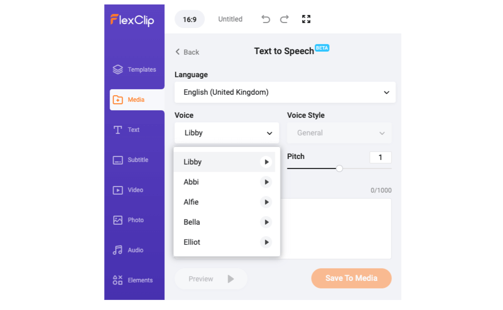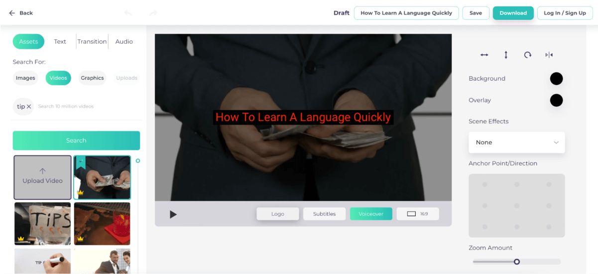 You can edit videos created using this service, i.e., change the background or template. You need to register to save the video.